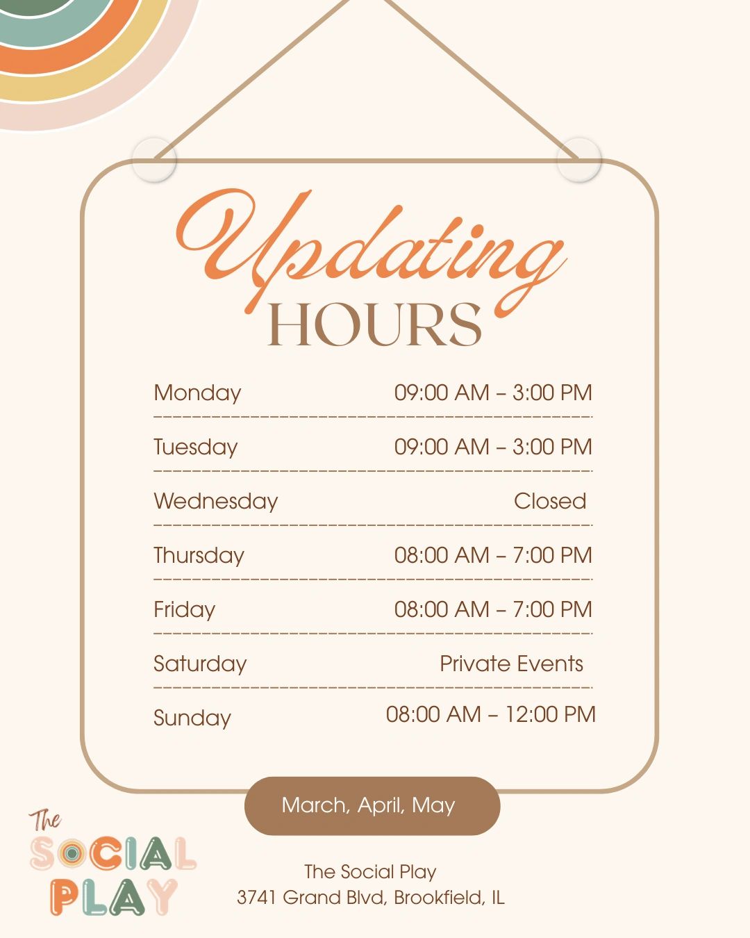 Please note that we have updated our weekly schedule. We are now closed on Wednesdays for play. Fit4Mom will now take place on Wednesday mornings.
